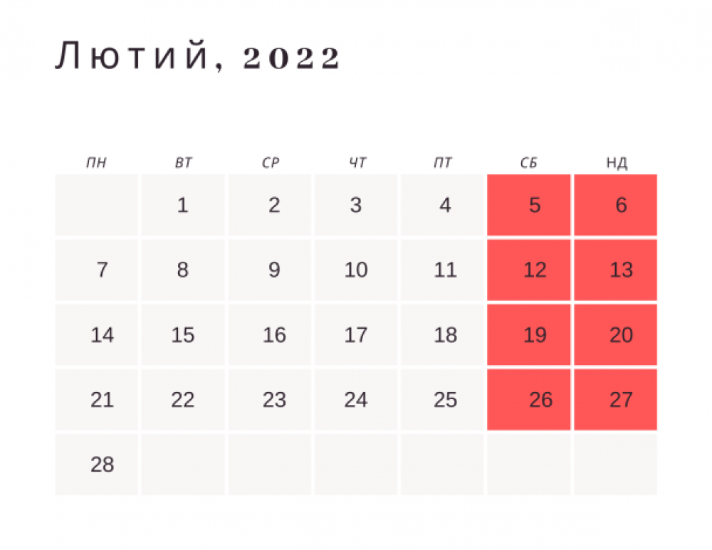 У лютому 2022 року українців чекає вісім офіційних вихідних днів, всі вони припадають на суботу та неділю: 5 і 6 лютого, 12 і 13 лютого, 19 і 20 лютого, а також 26 і 27 лютого.