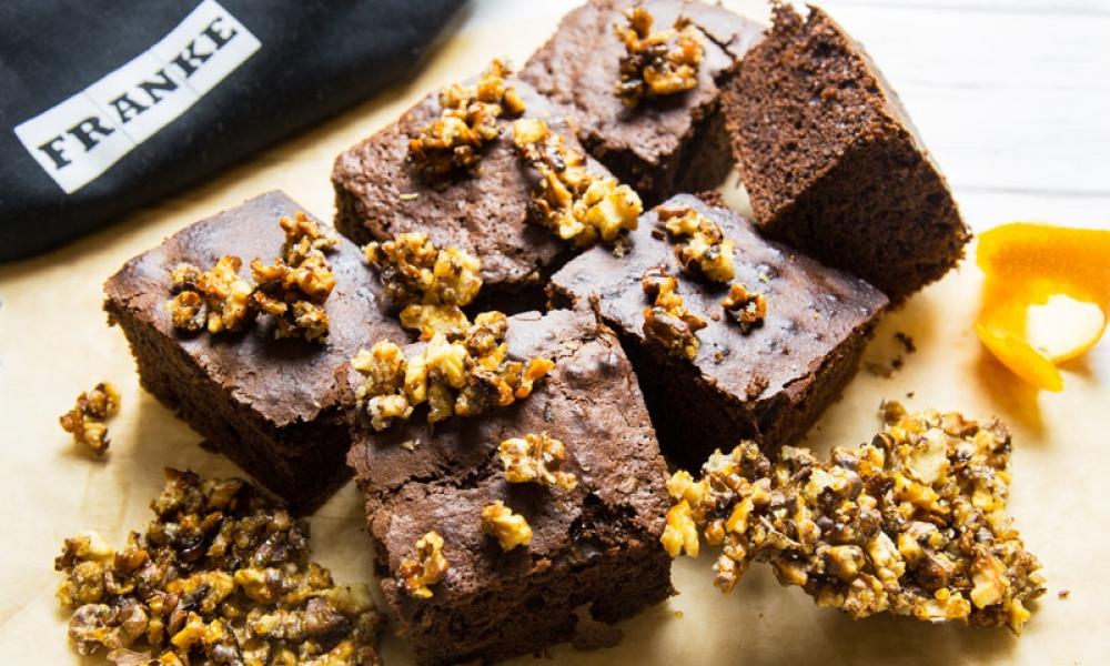 КРОК 6. Форму для запікання застеліть пергаментом. Це обов’язково умова, аби воно не прилипло в процесі запікання. Краще взяти форму діаметром 22 см. Перекладіть тісто, розрівняйте силіконовою лопаткою, а зверху посипте другою частиною горіхів. Ставте випікатися на 35-40 хвилин за температури 180 градусів. Поверхня брауні має взятися скоринкою.