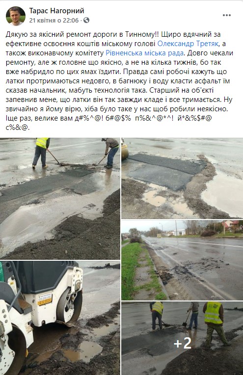 "Довго чекали ремонту, але ж головне що якісно, а не на кілька тижнів, бо так вже набридло по цих ямах їздити. Правда самі робочі кажуть що латки протримаються недовго, в багнюку і воду класти асфальт їм сказав начальник, мабуть технологія така. Старший на об'єкті запевнив мене, що латки він так завжди кладе і все тримається. Ну звичайно я йому вірю, хіба було таке у нас щоб робили неякісно," - підписав фото Тарас Нагорний.