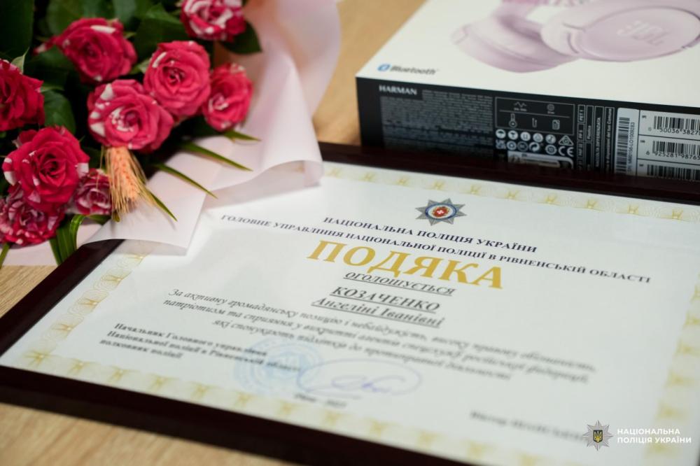 Керівник поліції Рівненщини Віктор Шанський подякував Ангеліні за свідому та принципову позицію, а мамі - за гідне виховання доньки. Крім того, лист-подяку скерували й до освітнього закладу.