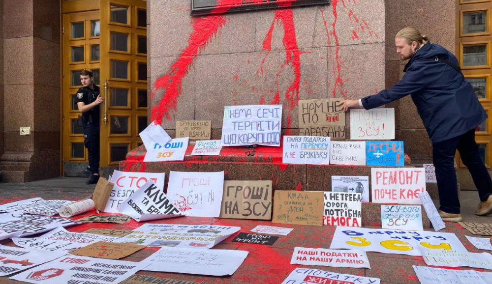 У суботу, 16 вересня, під стінами Київської міської державної адміністрації пройшов мітинг із вимогою витрачати столичний бюджет на потреби Сил оборони. Сходи будівлі облили червоною фарбою.