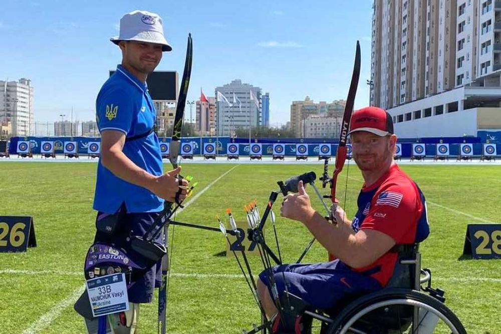 У змаганнях з парастрільби з класичного лука Василь Наумчук посів 33 місце, поступившись у плей-оф чинному чемпіону світу з США, який зображений на фото.