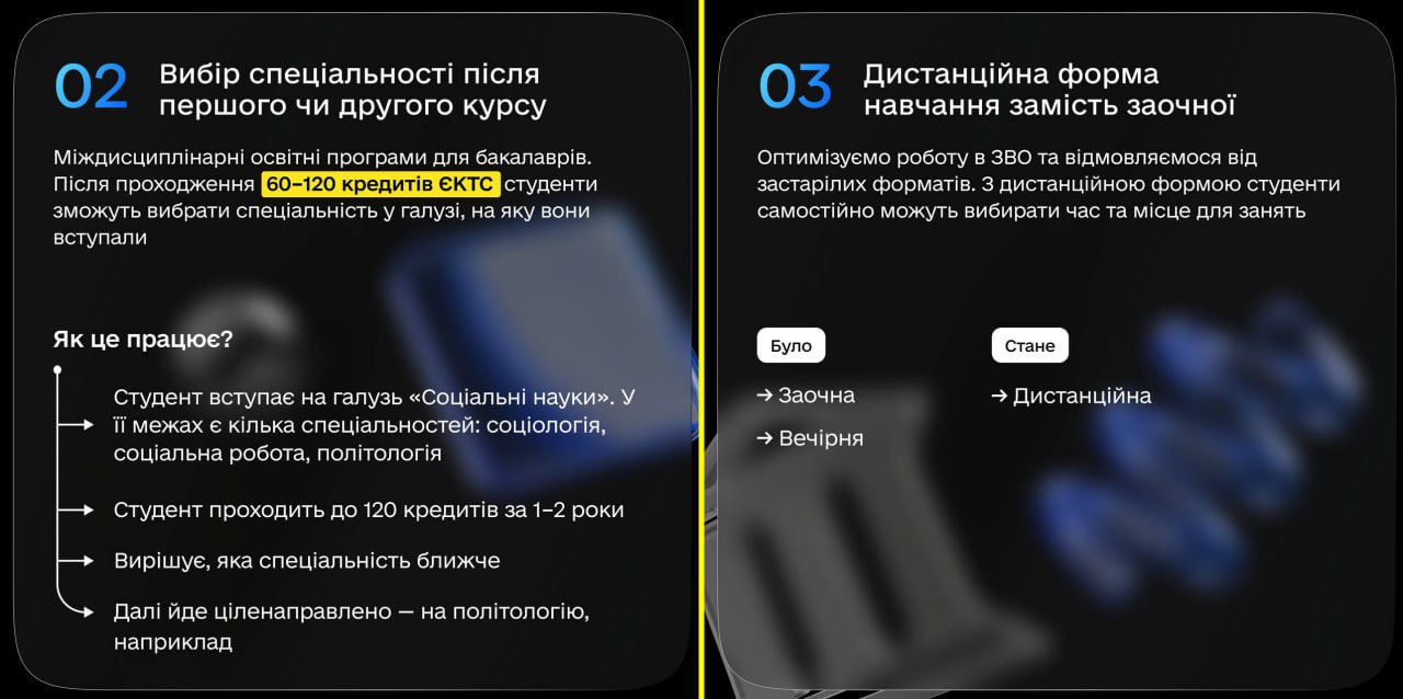Ще одне нововведення — вибір спеціальності після першого чи другого курсу. У 17 років складно вибрати професію на все життя, тому студентам дають більше часу та можливостей, щоб визначитися. Міністр цифрової трансформації Михайло Федоров пояснює:
