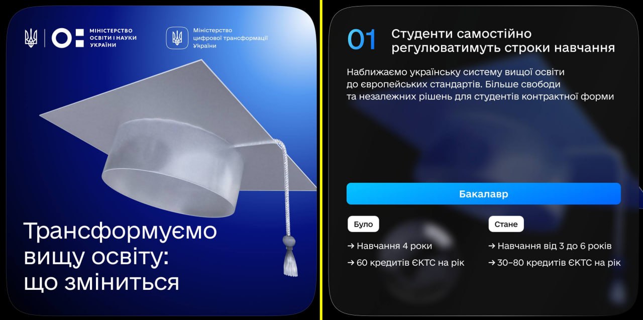 Одним із пунктів законопроєкту є регулювання студентами терміну навчання. Наприклад, самостійно можна буде пришвидшити навчання й завершити бакалаврат за 3 роки замість чотирьох. Чи навпаки — отримати ступінь за 6 років.