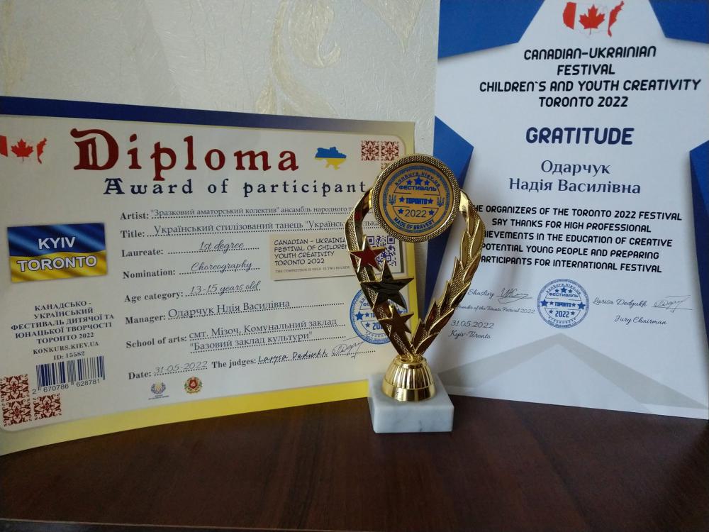 Аматорський ансамбль народного танцю «Надія» з Мізоча переміг у Міжнародному канадсько-українському фестивалі дитячої та юнацької творчості «Торонто 2022», який проходив дистанційно.