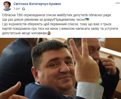 Нещодавно на своїй сторінці у Фейсбуці майбутня депутатка обласної ради Світлана Богатирчук-Кривко повідомила, що у кількох політичних партіях тиснуть на жінок з вимогою написати заяву та поступитися депутатським місцем чоловікам: