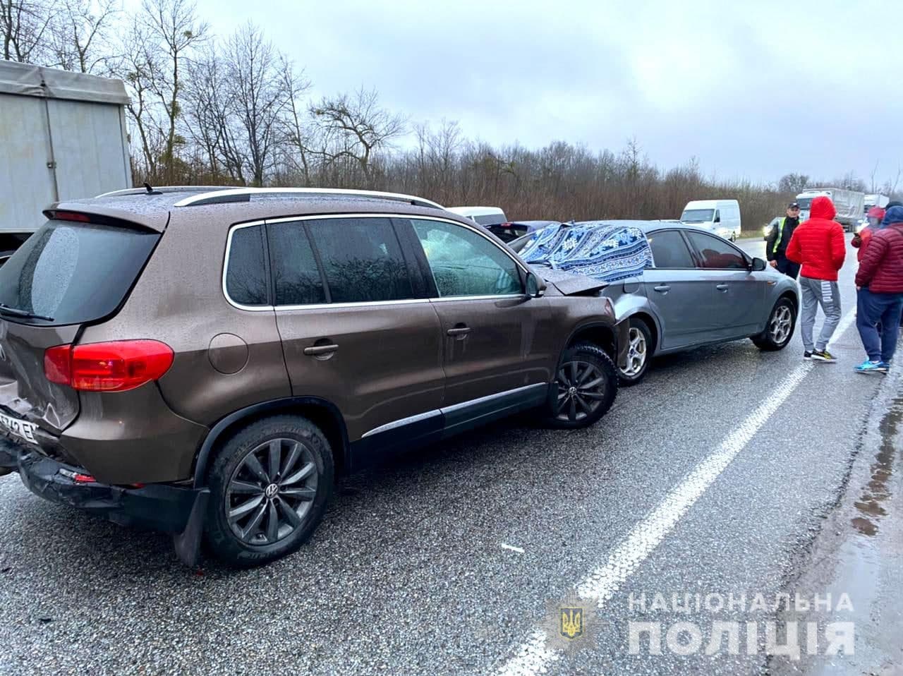Дорожньо-транспортна пригода сталася вчора, 15 квітня, близько 18 години на автодорозі «Київ-Чоп» поблизу села Дібрівка Рівненського району.   На місці події слідчий Рівненського районного управління поліції встановив, що водій автомобіля «Ford», житель міста Тернопіль, зупинився перед попутніми транспортними засобами через тимчасовий затор. Після цього в його транспортний засіб в’їхав автомобіль «Volkswagen Tiguan» під керуванням 42-річного жителя Львова. Потім за інерцією в автопригоду потрапило іще два авто: «Mazda 3» та «Mercedes-Benz».   Внаслідок ДТП до лікарні доставили чотирьох осіб із автомобіля «Mazda»: водія, 32-річного жителя міста Кременець, його 32-річну дружину та двох дітей 5-ти та 8-ми років. У всіх чотирьох діагностували незначні травми та забої, після чого їх відпустили додому. Усі кермувальники відповідно до освідування були тверезі.   За фактом порушення правил безпеки дорожнього руху розпочато досудове розслідування за частиною 1 статті 286 Кримінального кодексу України. Транспортні засоби поміщені на спец майданчик, повідомляє відділ комунікації поліції Рівненської області.   ЧИТАЙТЕ ТАКОЖ: У ДТП біля Дубна постраждало двоє дітей (ФОТО, ВІДЕО) Шукайте нас ??? Офіційний сайт Соціальні мережі: ► Ми у Facebook ► Ми в Instagram ► Наш Telegram-канал