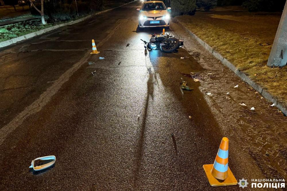 Мотоцикліста госпіталізували до лікарні з відкритим перелом ноги. Відомо, що він був у мотошоломі, однак посвідчення водія відповідної категорії не мав.