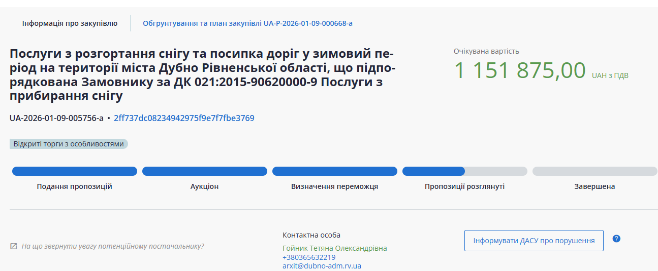 Управління архітектури, містобудування, житлово-комунального господарства та земельних відносин Дубенської міської ради оголосило тендер на послуги з розгортання снігу та посипки доріг у зимовий період на території Дубна.