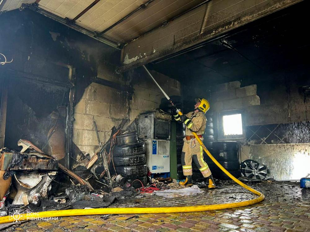 "Вогонь встиг знищити 11 автомобільних шин, 2 акумуляторні батареї, стіну та стелю на площі 12 м², гаражні ворота, електроінструмент, обшивку над гаражем - близько 10 м², речі домашнього вжитку та пошкодити автомобіль BMW X5, стіну та стелю підсобного приміщення та дерев'яне перекриття", - повідомили в ДСНС Рівненщини.