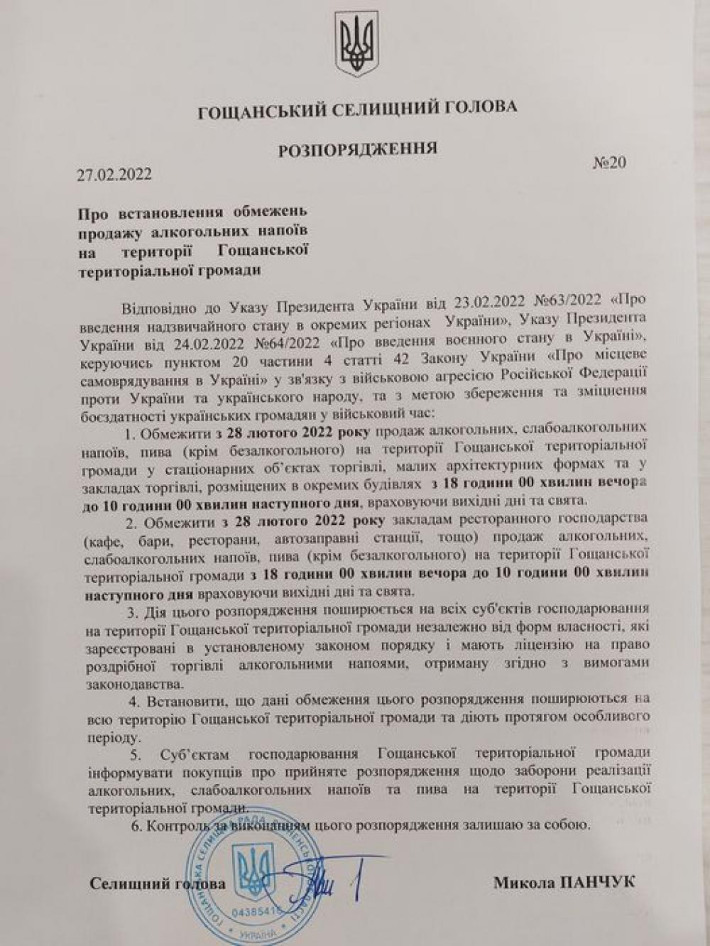 Відповідно до розпорядження Гощанського селищного голови Миколи Панчука з 28 лютого 2022 року, з метою збереження та зміцнення боєздатності українських громадян у військовий час, на території Гощанської територіальної громади: