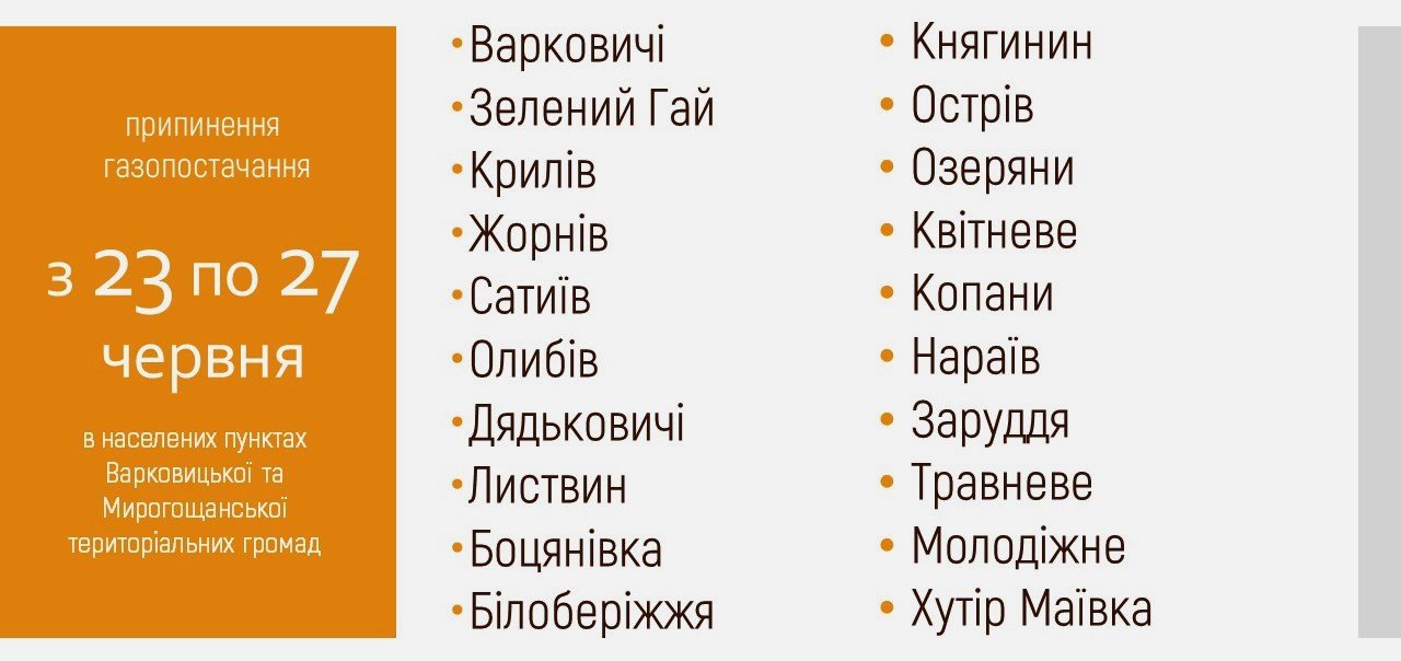 На території Дубенщини 23 червня з 08:00 по 17:00 27 червня буде припинено газопостачання.