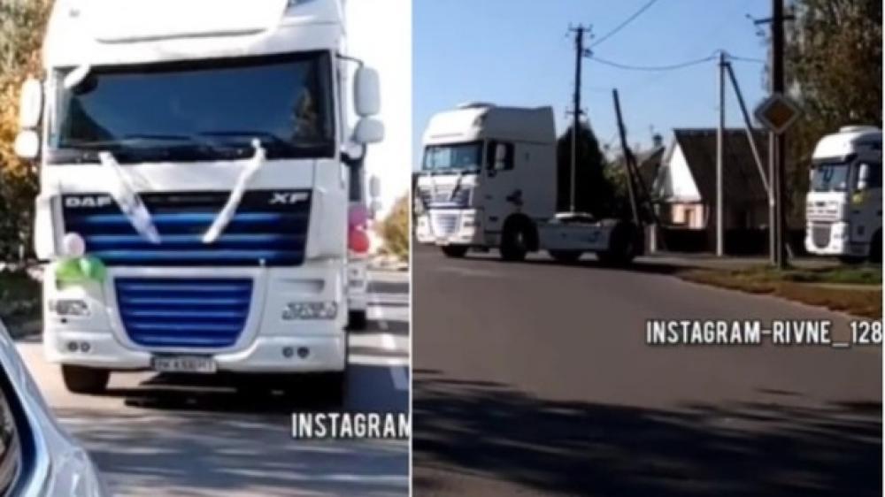 Нестандартний кортеж їздив у неділю вулицями Костополя. Транспортом для молодят замість традиційних легковиків були тягачі від фур. Той, на якому їздила наречена, прикрасили фатою.