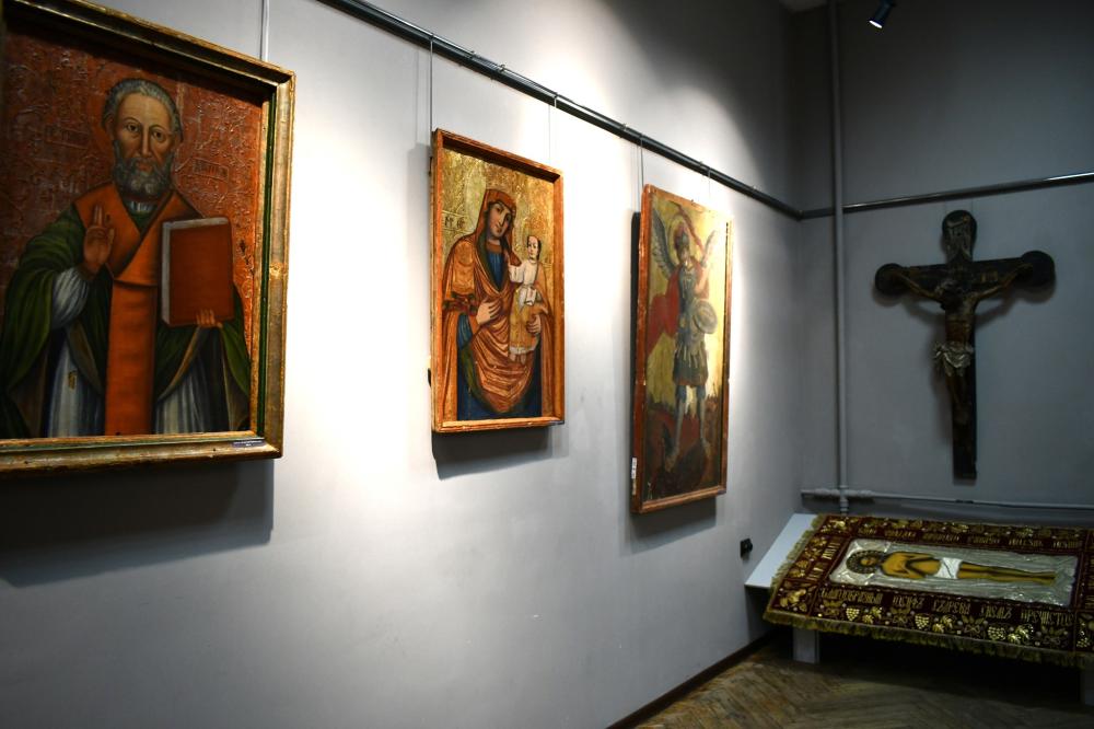 Експозиція умовно поділена на дві частини. Перша представляє сакральні пам’ятки XVII–XIX століть: старовинні ікони, натільні та напрестольні хрести, плащаницю, а також факсимільну копію Пересопницького Євангелія.