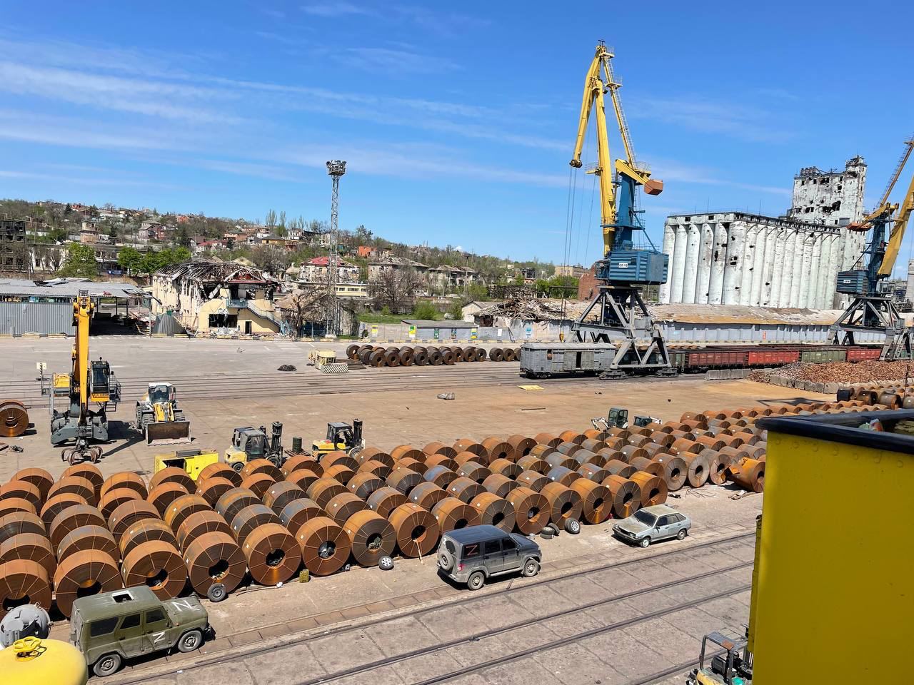 Навіть візуально тут металопрокату на декілька десяткі млн. долларів США. Окрім металопрокату в порту зберігається декілька тисяч тон зерна. Саме тому Маріуполь досі не отримав “офіційного шефського регіону росії”. Тому, що тут мова не про “інвестувати та відновлювати”, а “грабувати та розподіляти прибуток”.