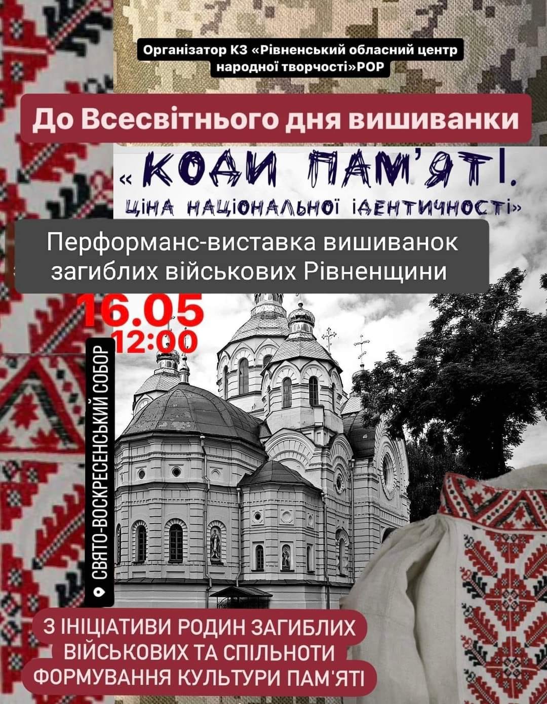 16 травня, у Всесвітній день вишиванки, біля Свято-Воскресенського кафедрального собору ПЦУ в центрі Рівного можна буде побачити вишиванки наших загиблих Захисників.