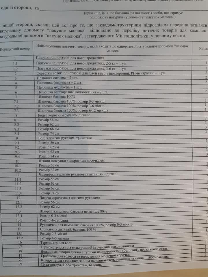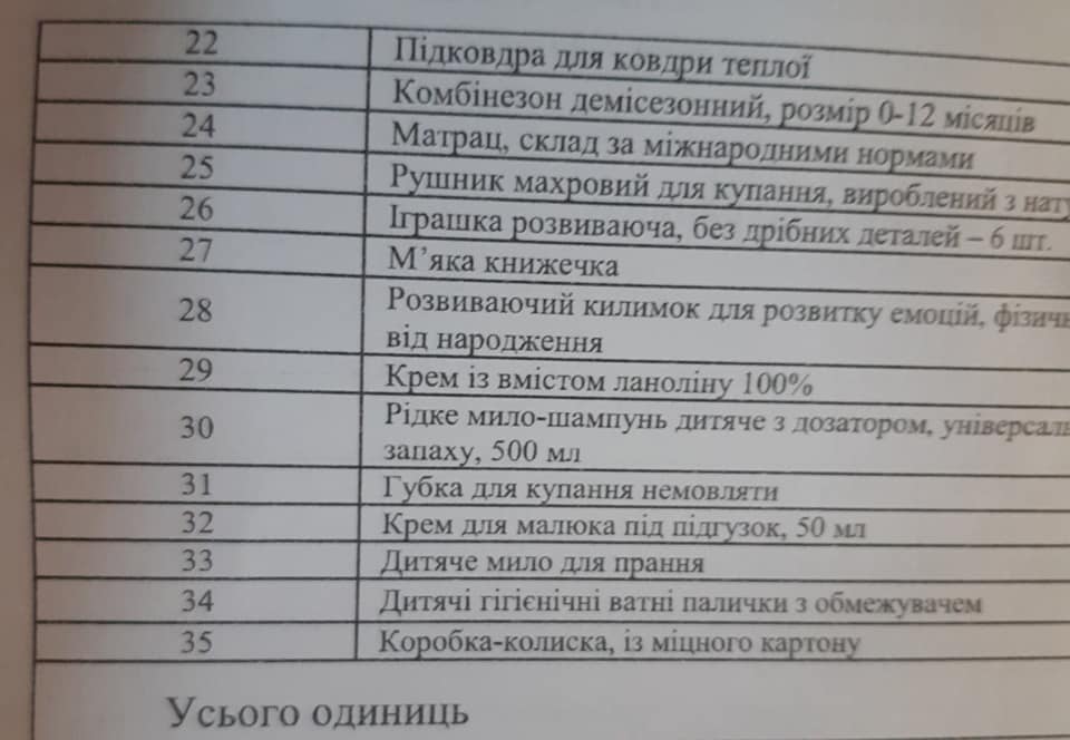 Також у закладі показали перелік того, що входить у пакунок малюка нового зразка.