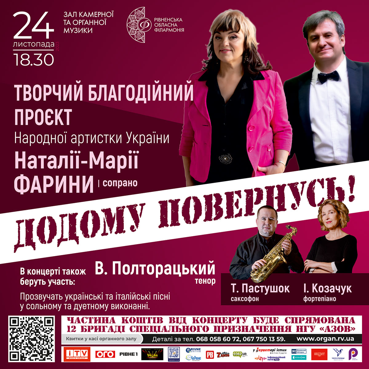 Благодійний творчий вечір народної артистки України Наталії-Марії Фарини пройде 24 листопада у Органному залі у Рівному.