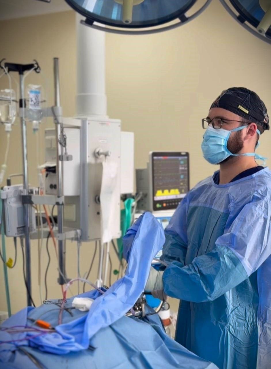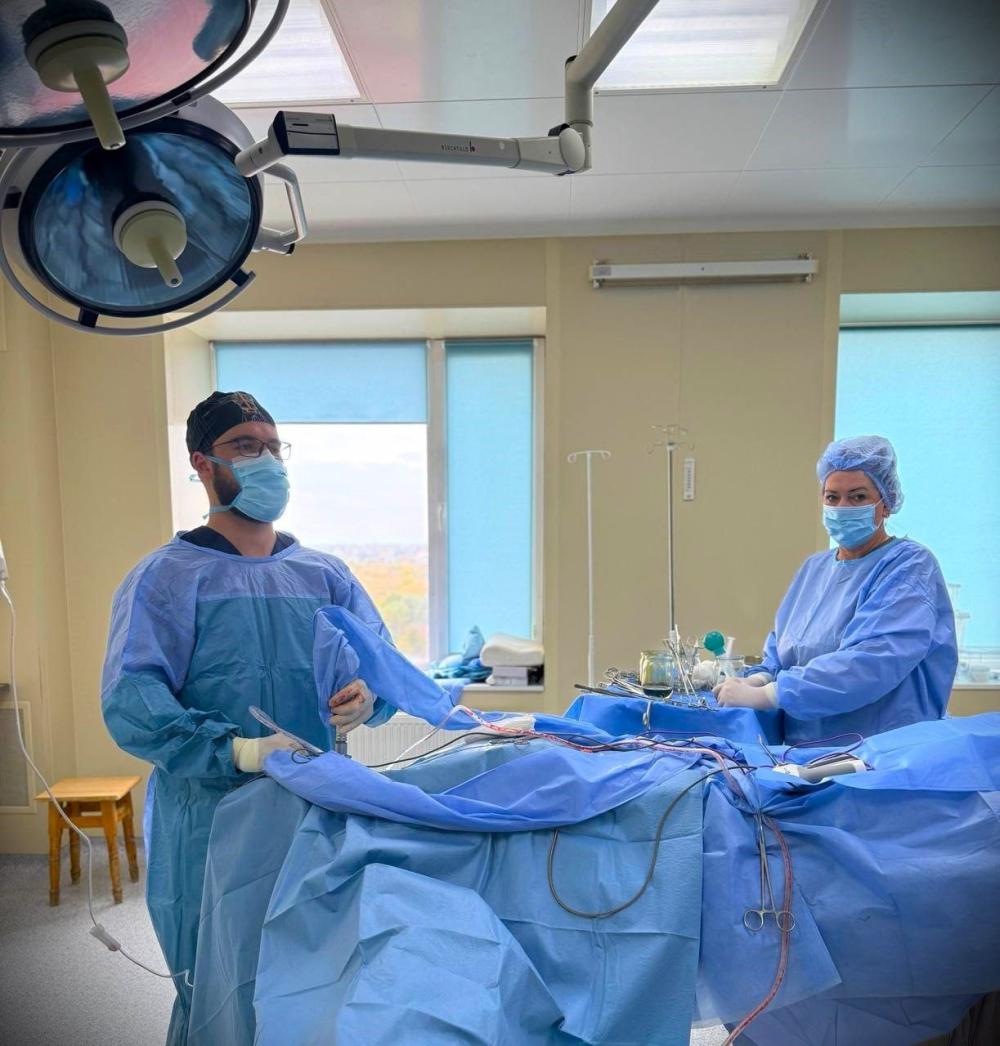 На фото видно, як лікар хірург-онколог Олександр Боярський виконує відеомедіастиноскопію та біопсію лімфовузлів середостіння, з метою верифікації захворювання та визначення подальшої тактики лікування. Визначити тип пухлини не могли іншими методами.