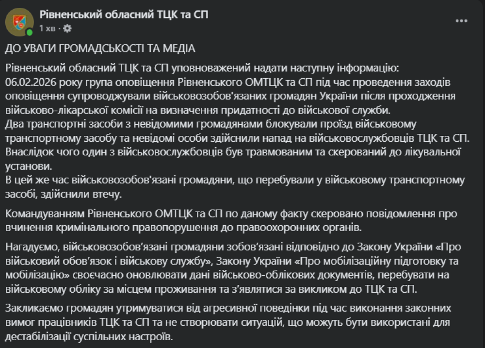 У Рівненському ОТЦК та СП прокоментували інцидент, який стався 6 лютого. А саме, напад на групу оповіщення та втечу військовозобов'язаних.