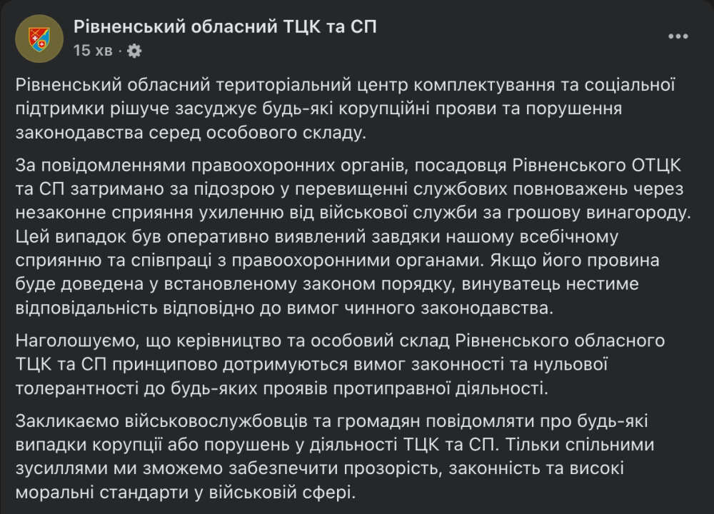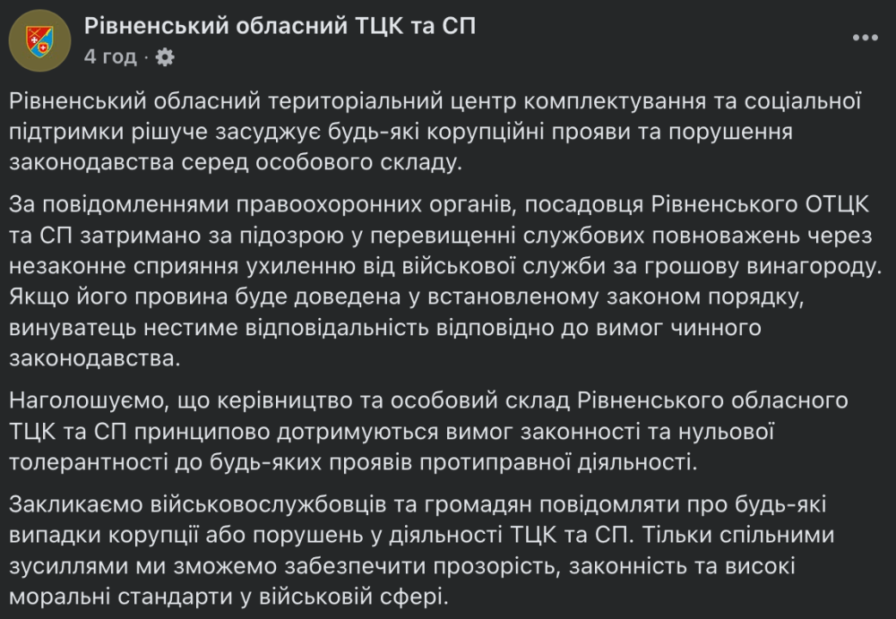 «Рівненський обласний територіальний центр комплектування та соціальної підтримки рішуче засуджує будь-які корупційні прояви та порушення законодавства серед особового складу», — наголошують у ТЦК.