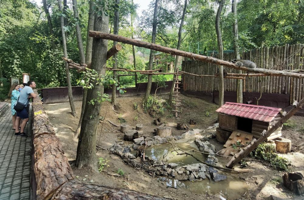 Після карантину та інших необхідних заходів для подальшого утримання в зоопарку єноти розміщені на території в умовах, близьких до природних місць проживання. Загальна площа території з двох сполучених вольєрів не менше 150 м2 (згідно з нормами), забезпечена природним джерелом води та укриттями. Також експозиція оснащена освітніми стендами.