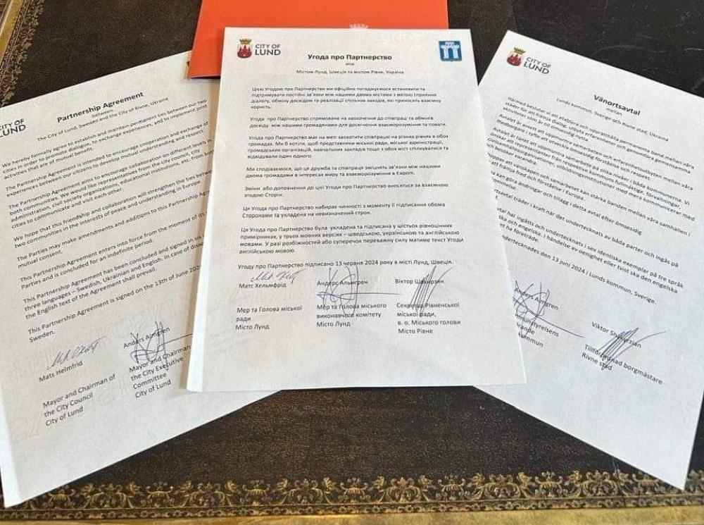 Рівне отримало ще одного потужного партнера у Європі. Ним стало швецьке місто Лунд. Угоду про партнерство між містами урочисто підписали у ратуші міста вчора, 13 червня, секретар Рівненської міської ради, виконувач обов’язків міського голови Рівного Віктор Шакирзян, Голова міської ради міста Лунд пан Матс Хельмфрід та Голова міського виконавчого комітету міста Лунд пан Андерс Альмгрен.