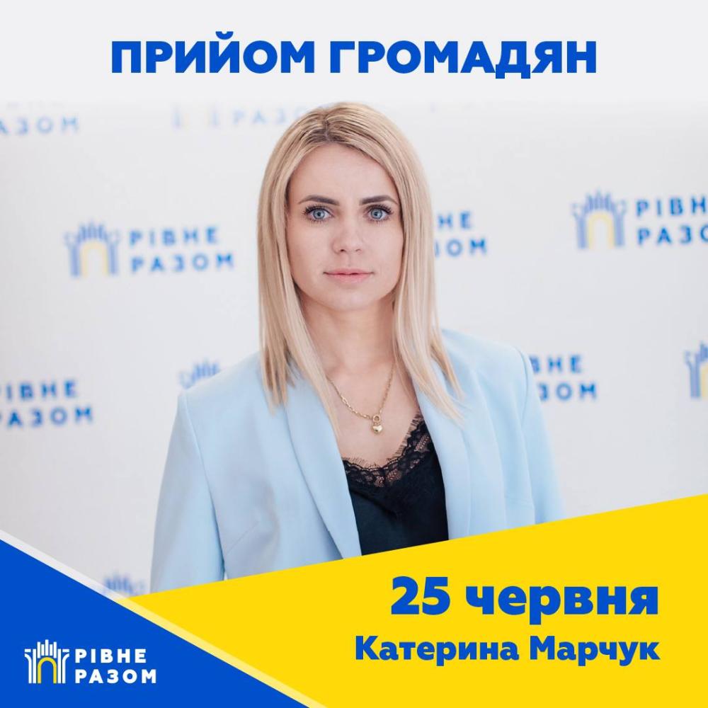 У вівторок, 25 червня, у громадській приймальні «Рівне Разом» особистий прийом громадян проведе депутатка Рівненської міської ради, голова постійної комісії з питань міського господарства,транспорту, зв’язку та екології Катерина Марчук.