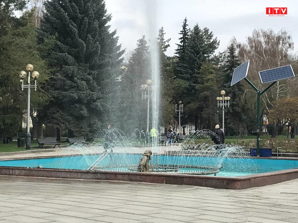 Фонтани мають запрацювати до великодніх свят. Працівники водоканалу налаштовують малий фонтан із підсвіткою та музичним супроводом за кінопалацом Україна.