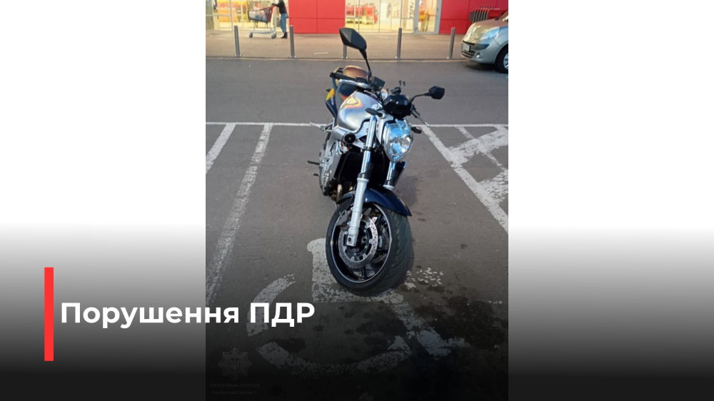 Нещодавно на парковці одного з торгових центрів Рівного інспектори помітили мотоцикл Yamaha, водій якого проігнорував ПДР та припаркував свій транспортний засіб на місцях для людей з інвалідністю.