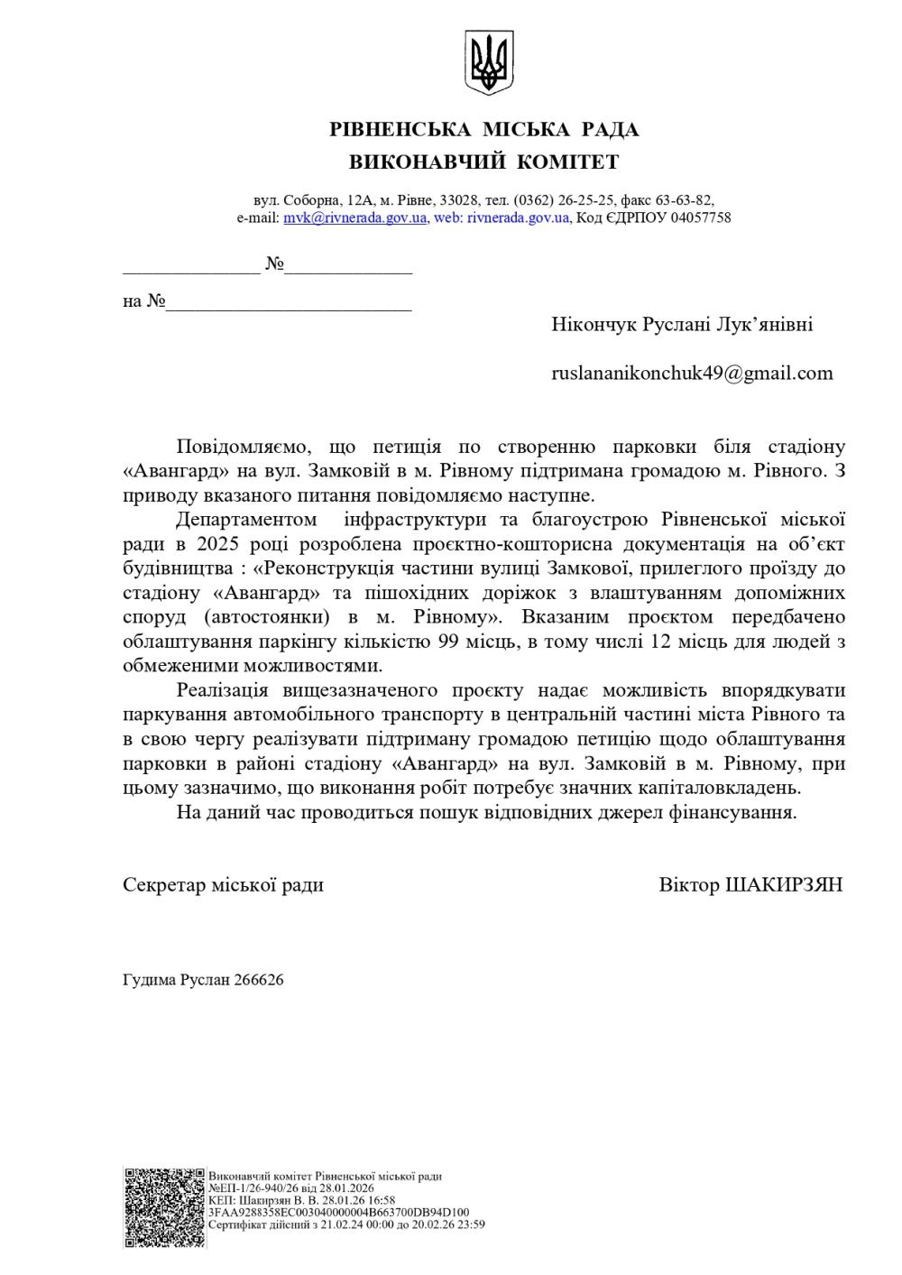 У своїй відповіді Віктор Шакирзян зазначив, що Департамент інфраструктури та благоустрою Рівненської міської ради в 2025 році розробив проєктно-кошторисну документацію на об’єкт будівництва: «Реконструкція частини вулиці Замкової, прилеглого проїзду до стадіону «Авангард» та пішохідних доріжок з влаштуванням допоміжних споруд (автостоянки) в м. Рівному». Вказаним проєктом передбачено облаштування паркінгу кількістю 99 місць, в тому числі 12 місць для людей з обмеженими можливостями.