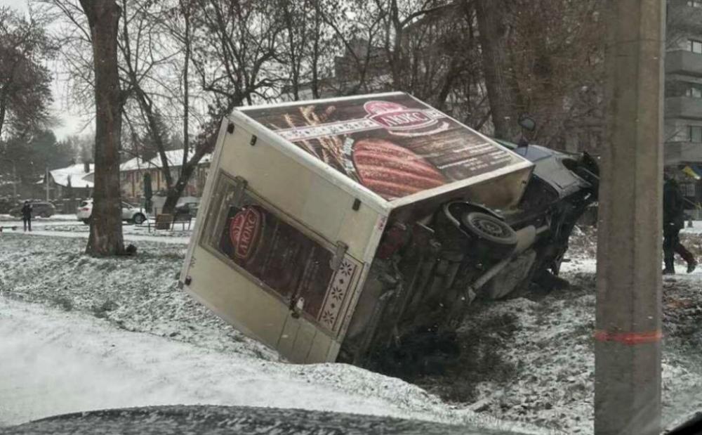 Через слизьку дорогу біля супермаркету АТБ перевернувся фургон-хлібовоз.