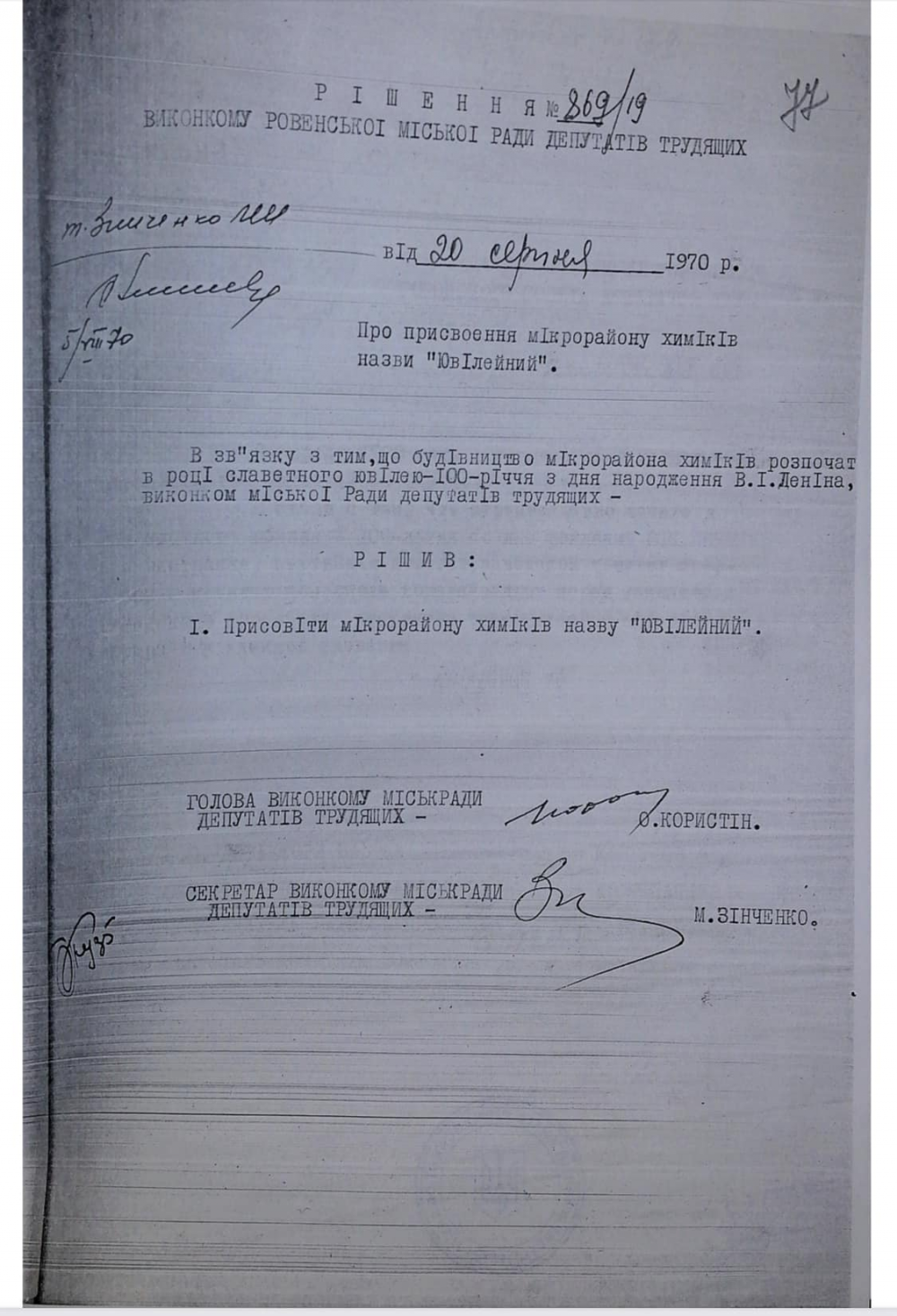 “В рамках декомунізації і дерусифікації міста маємо спільно прийняти рішення щодо перейменування мікрорайону "Ювілейний". З цього приводу раніше було чимало дискусій. Купа різноманітних версій щодо походження цієї назви. Зараз, ми не маємо жодних сумнівів, адже завдяки працівникам апарату Рівнеради та архівного відділу вдалося відшукати документи, які засвідчують, що цей мікрорайон отримав свою назву, відповідно до рішення тоді ще Виконкому Ровенської міської ради депутатів трудящих від 20 серпня 1970 року, і названий так на честь 100-річчя з дня народження так званого "вождя пролетаріату" Володимира Леніна”. Безумовно, було б найкраще, на мою думку, дати мікрорайону якусь найбільш притаманну йому назву, наприклад “Хіміків”, або за географічним його місцем розташування “Західний”, але краще, якщо це вирішуватиметься на основі пропозицій від рівнян. Тому, як голова Комісії з питань найменування міських об’єктів, я дав доручення Управлінню культури з’ясувати думку рівнян, провести онлайн опитування, зібрати пропозиції і ті, які найчастіше будуть подані людьми уже розглянемо в якості нової назви мікрорайону”, - зазначив Секретар Рівнеради Віктор Шакирзян.