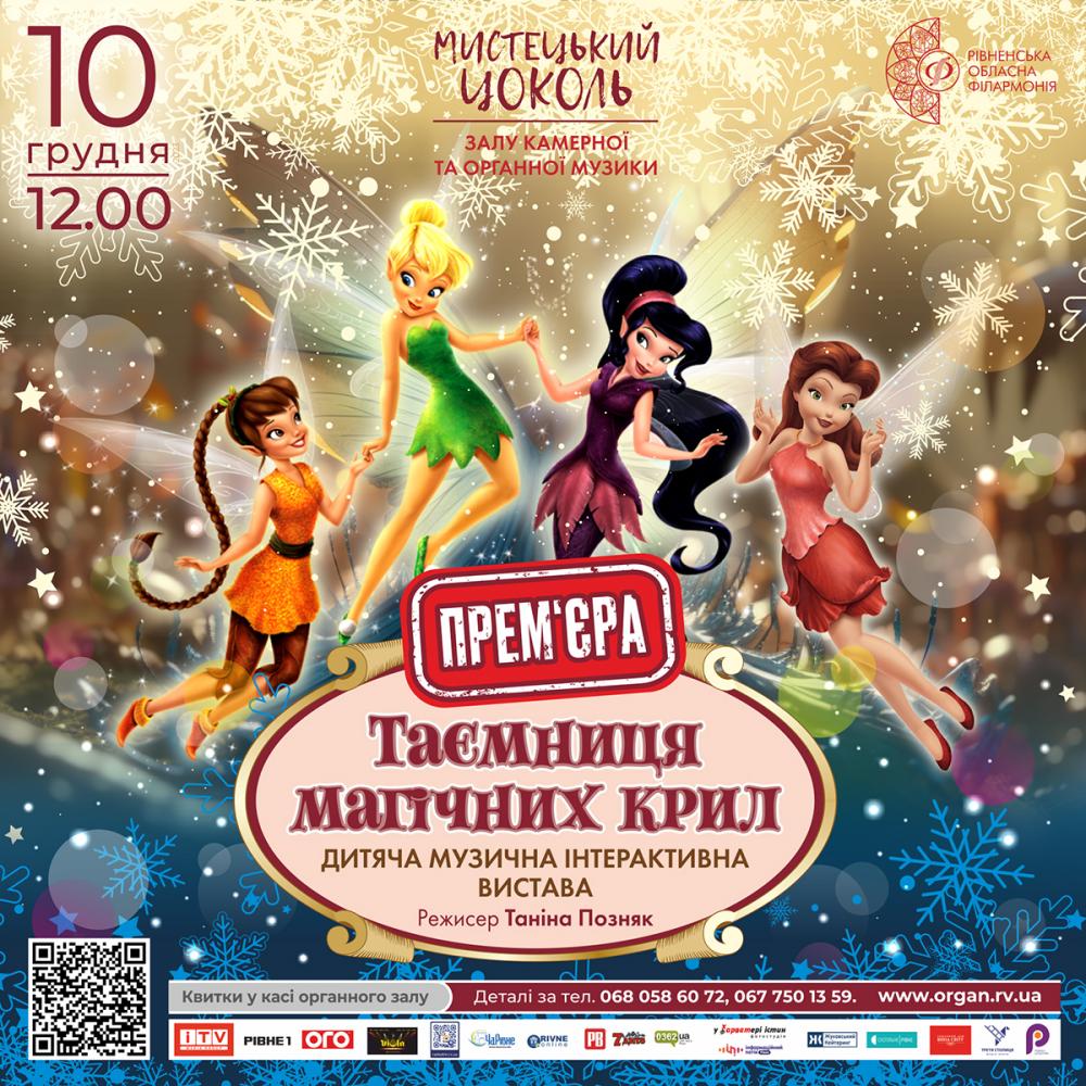 10 та 24 грудня о 12:00 в Органному залі на діток чекає прем’єра дитячої музичної інтерактивної вистави «Таємниця магічних крил». Це добра історія про маленьку Фею Дінь-Дінь, яка усім серцем прагне відчути і віднайти свій талант для того, аби зробити світ добрішим і красивішим.