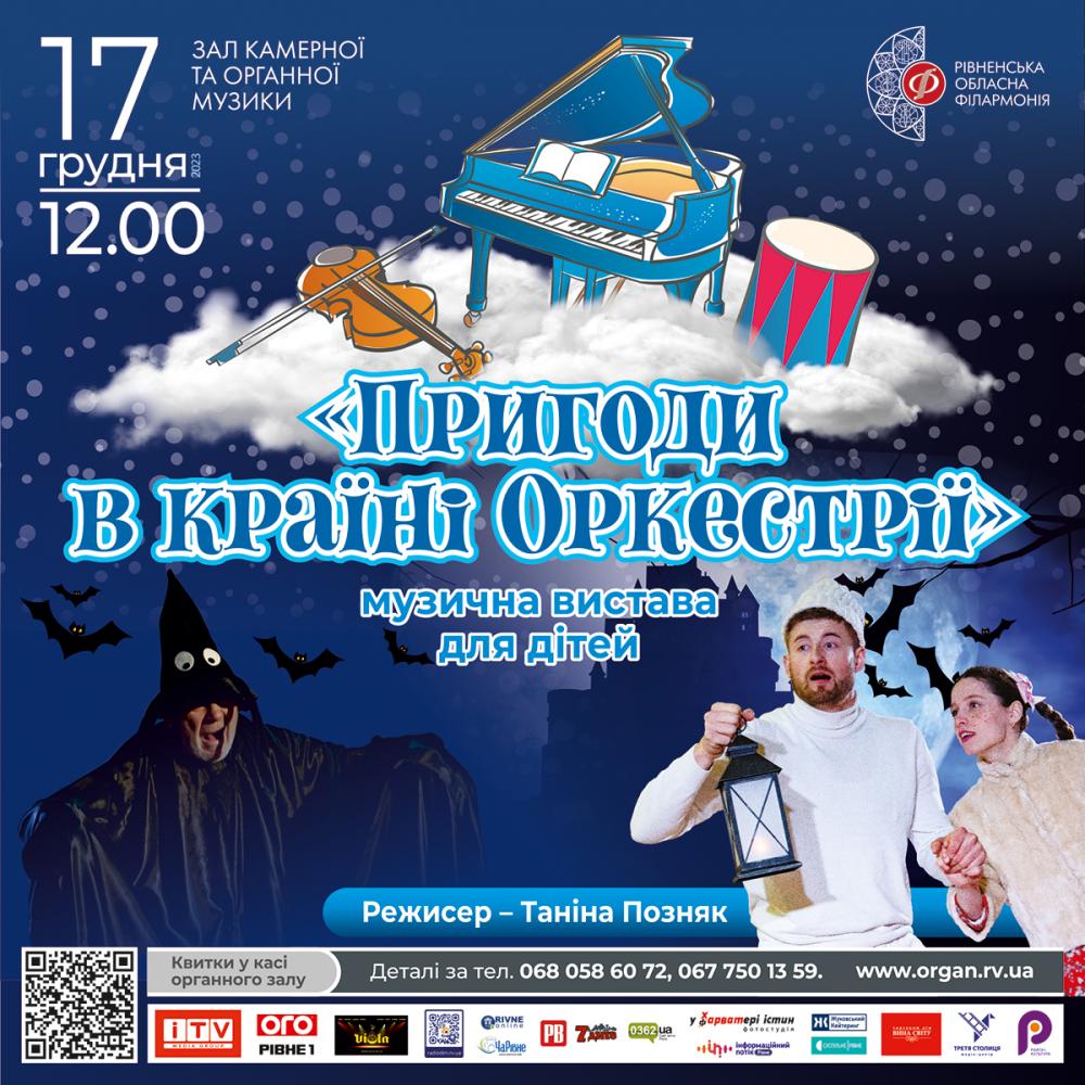 17 грудня о 12:00 покажуть новорічну казку «Пригоди в країні Оркестрії». Це казка про добро, яке завжди перемагає. Герої казки: Миколай Чудотворець, Володар Зландії, Морок, Цвіркун-віртуоз та дивовижні музичні інструменти, які оживають у країні Оркестрії