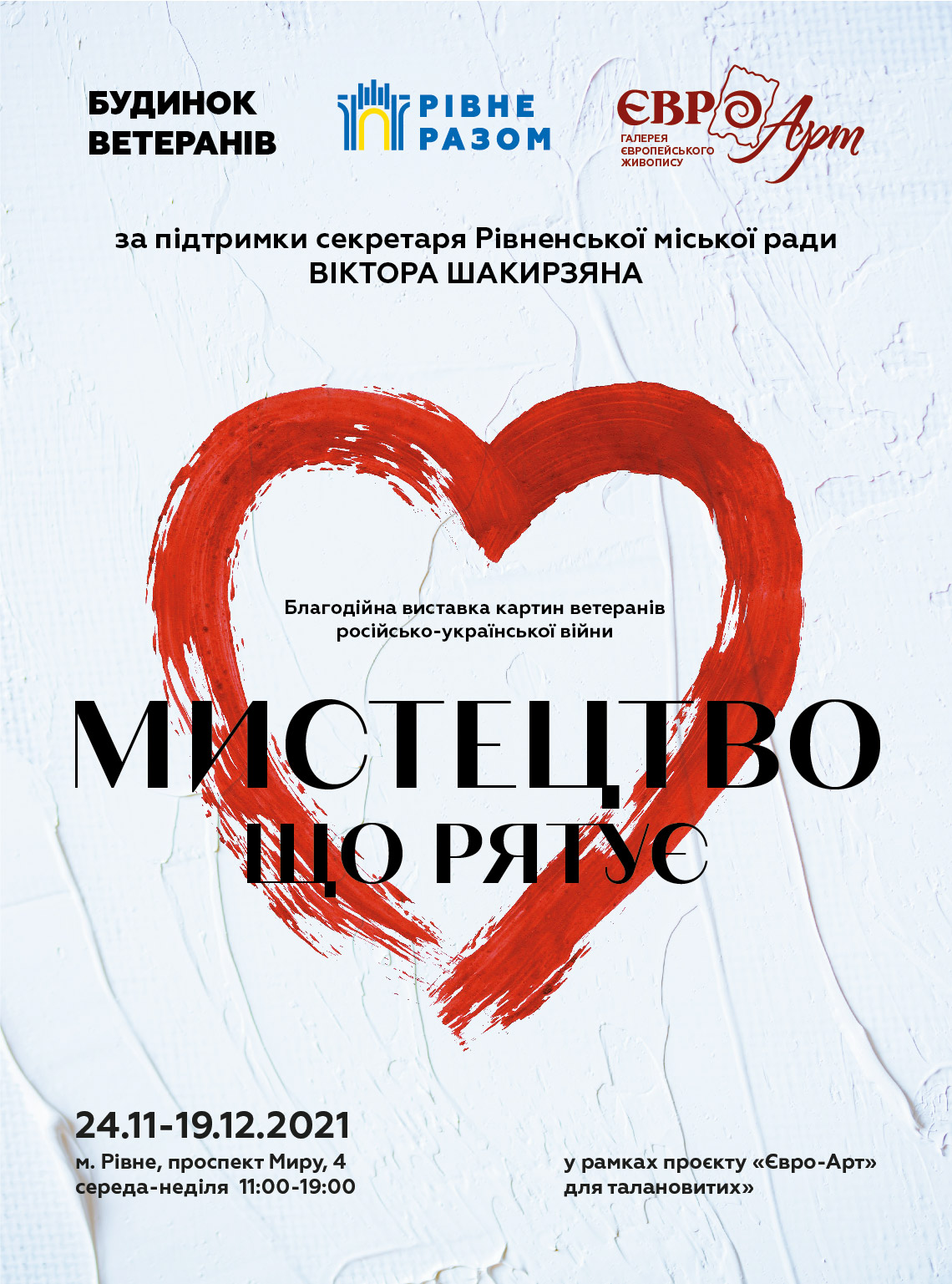 В Рівному в період із 24 листопада до 19 грудня у художній галереї «Євро-Арт» пройде благодійна виставка «Мистецтво, що лікує». На виставці будуть представлені майже півсотні картин, намальованих важкопораненими ветеранами АТО/ООС та родинами загиблих.