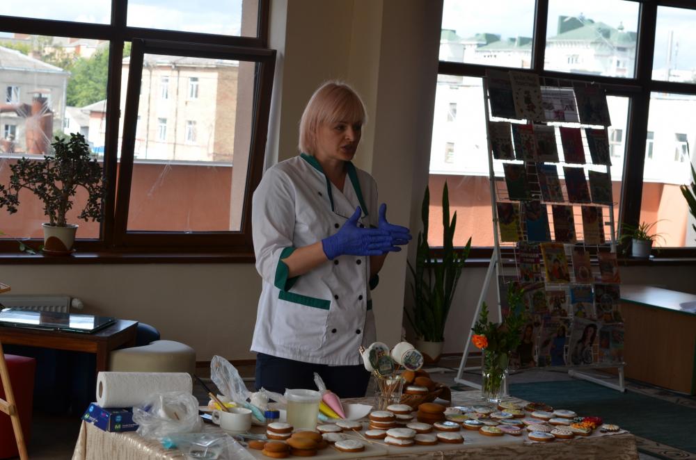 Викладачка спецдисциплін розповіла присутнім про діяльність Рівненського центру ПТО ДСЗ, а майстер виробничого навчання провели майстер-клас сучасних технологій з кондитерської майстерності, а саме, прикрашання імбирного пряника айсінгом і вафельною картинкою – пластинами з рисового паперу, який використовується для декорування тортів, тістечок, пряників, на якому зображується малюнок, роздрукований на харчовому принтері.