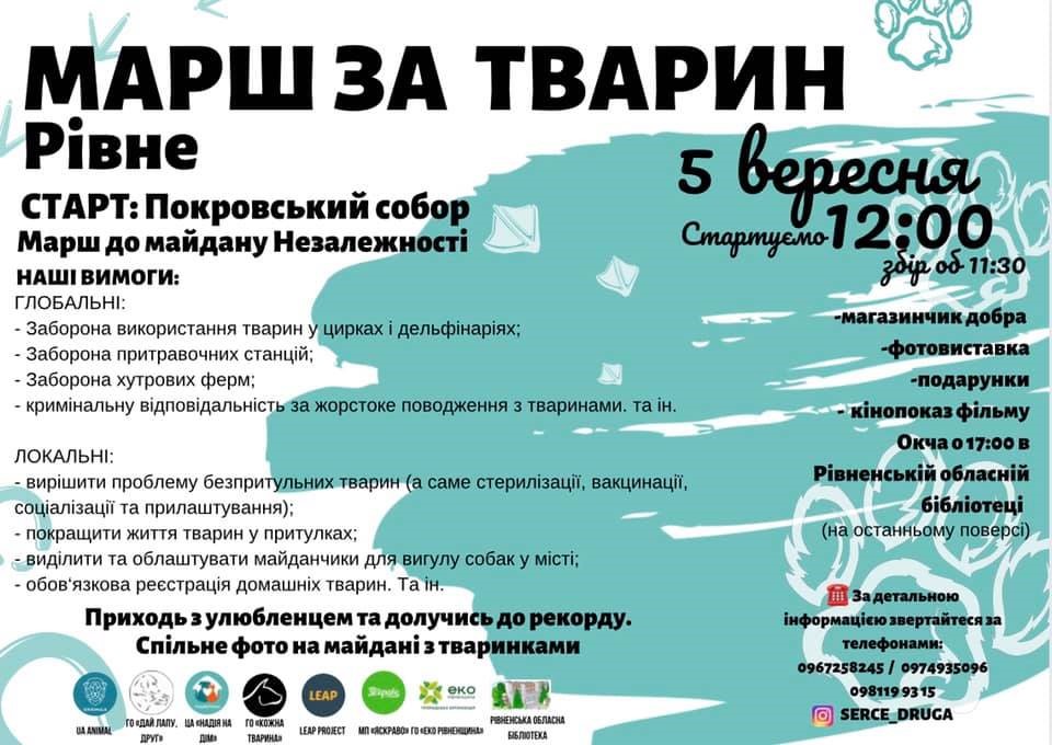 В неділю, 5 вересня о 12:00 за ініціативи гуманістичного руху UAnimals відбудеться головна гуманістична подія країни. Мешканці усіх областей одночасно пройдуть головними вулицями своїх міст, аби привернути увагу до питання захисту тварин від жорстокості. Пройде Всеукраїнський марш і в місті Рівне.