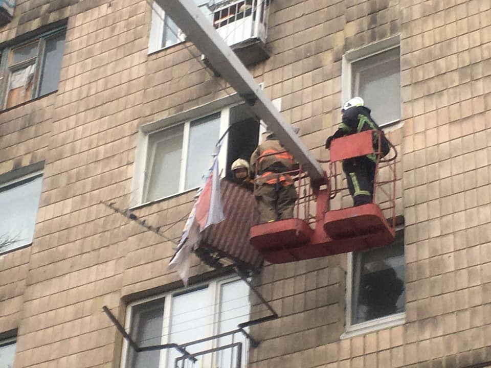 Рятувальники спецобладненням зрізали металеві конструкції та за допомогою пожежного колінчатого підйомника спустили їх до низу.