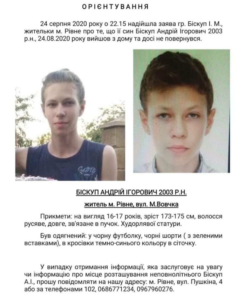Про те, що 17-річний підліток пішов з дому й не повернувся, до поліції повідомила матір.Біскуп Андрій Ігорович, 2003 р.н., житель міста Рівне.