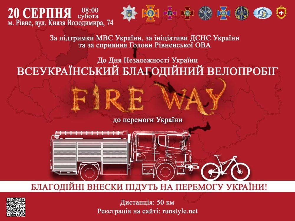 У Рівному, 20 серпня, відбудеться 2-й благодійний велопробіг під назвою "Fire Way до Перемоги України", що присвячений 31-й річниці з Дня Незалежності України.