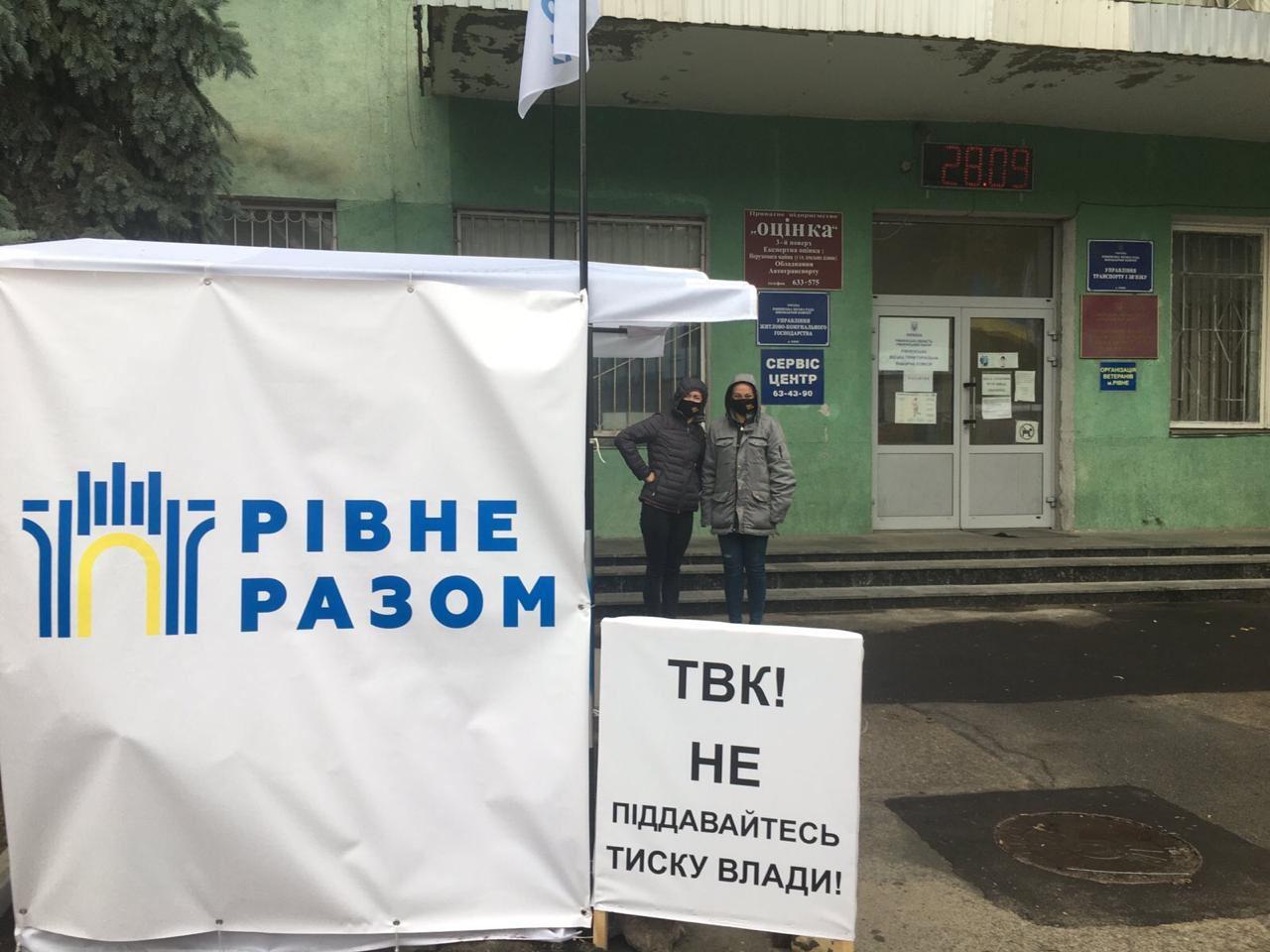 «Ми, представники політичної партії “Рівне Разом”, проводимо безстрокову акцію протесту проти свавілля представників чинної влади, і вимагаємо зупинити тиск на представників ТВК, не перешкоджати роботі комісії та реєстрації кандидатів від нашої партії на місцевих виборах, а дати можливість ТВК розглянути пакет документів, поданий в строк відповідно до чинного законодавства».