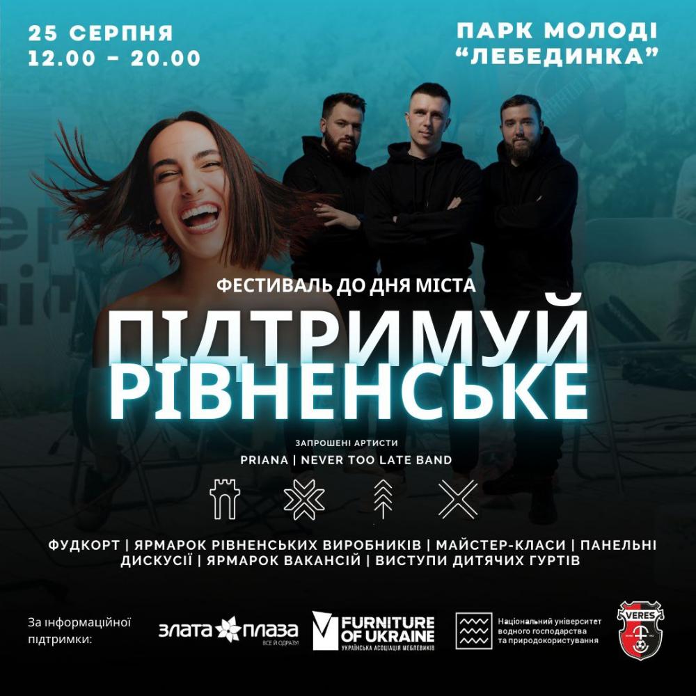 25 серпня з 12:00 до 20:00 у Парку молоді «Лебединка» буде проводитись фестиваль "Підтримуй Рівненське".