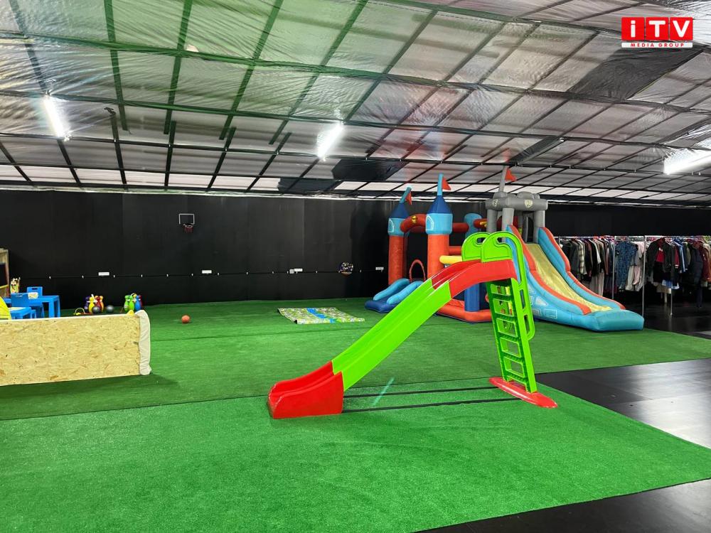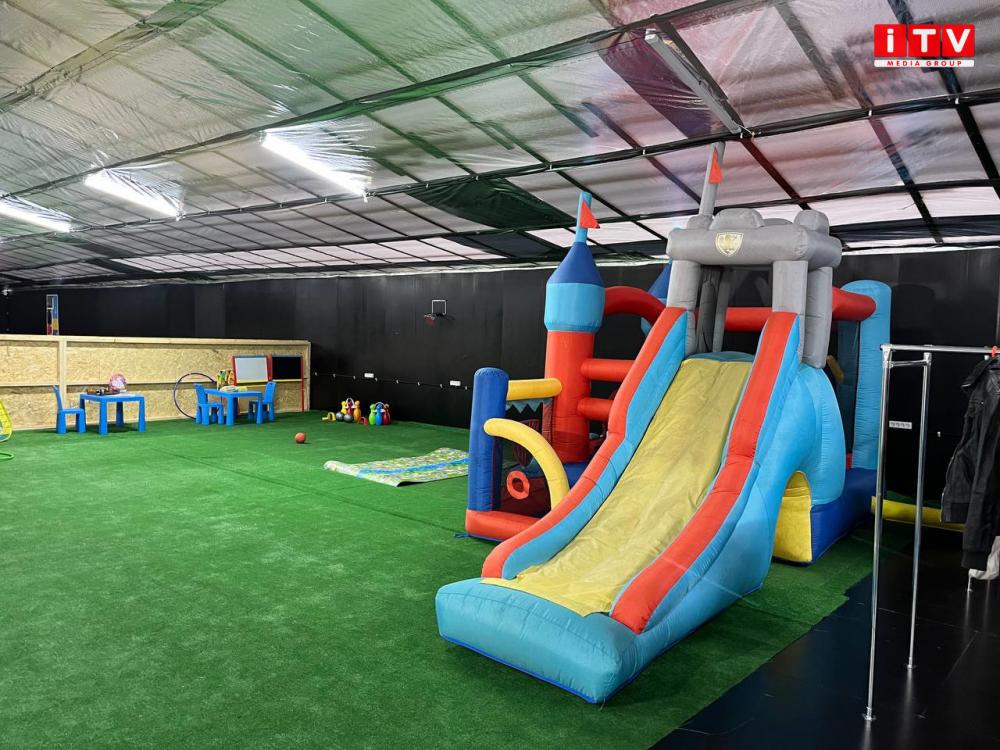 Для дітей у наметі виділена зона для розваг та ігор. На м'якій підлозі діти можуть побігати, скотитися з гірки та погратися м'ячами. Також у куточку є надувний батут для малечі.
