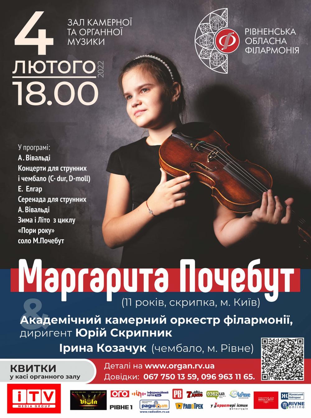 4 лютого 11-річна скрипалька Маргарита Почебут та Академічний камерний оркестр філармонії, диригент Юрій Скрипник проведуть концерт у Рівному.