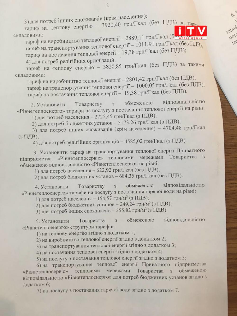 5. Установити Товариству з обмеженою відповідальністю «Рівнетеплоенерго» структури тарифів: