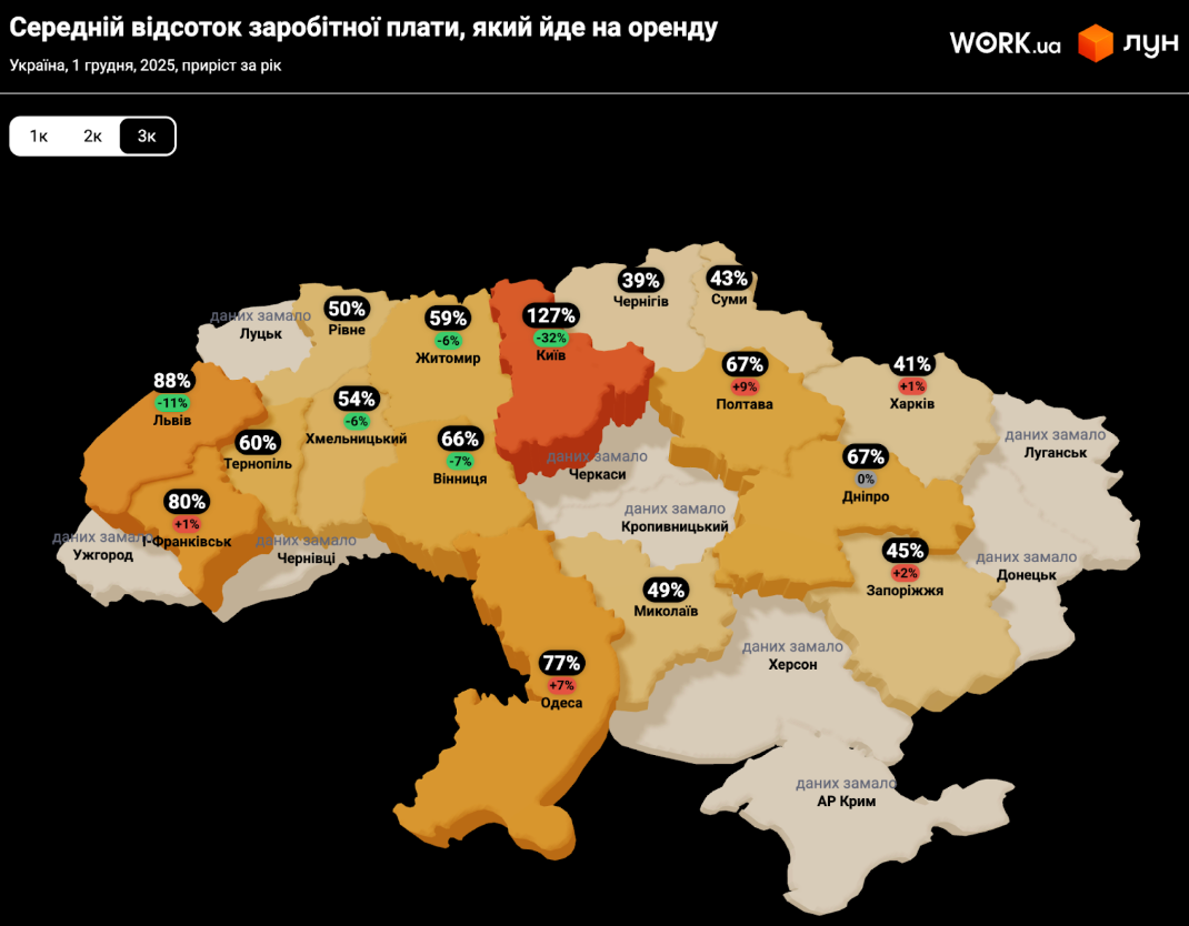 Мешканці Рівного витрачають на оренду 50% свого доходу, що на 4% більше, ніж минулого року. Для порівняння, у Львові цей показник становить близько 46%, у Києві – 42%, а в Одесі – 44%.