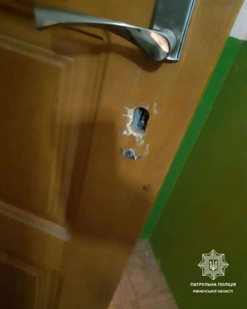 Рівнянка ще о 3-ї ночі почула дивний шум біля квартири сусідів і побачила біля дверей кремезного чоловіка, який намагався відчинити двері. Але, позаяк, у нього не вийшло, він зник. За деякий час, пильна сусідка знову почула дивний звук біля квартири сусідів та побачила того самого чоловіка, який тим часом зламав замок вхідних дверей та проник в середину квартири.