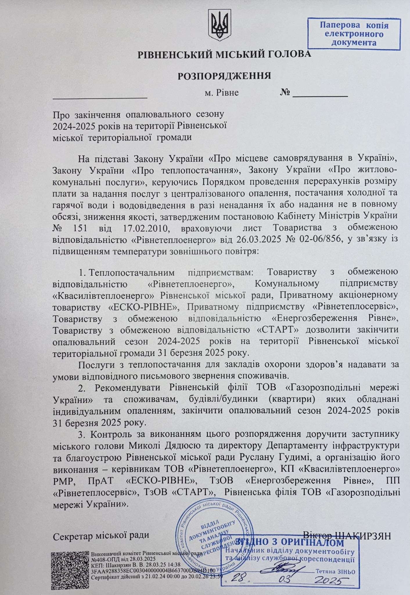 Відтак теплопостачальні підприємства ТОВ «Рівнетеплоенерго», КП «Квасилівтеплоенерго», ПАТ «ЕСКО-Рівне», ПП «Рівнетеплосервіс», ТОВ «Енергозбереження Рівне», ТОВ «СТАРТ» припиняють подачу тепла споживачам.