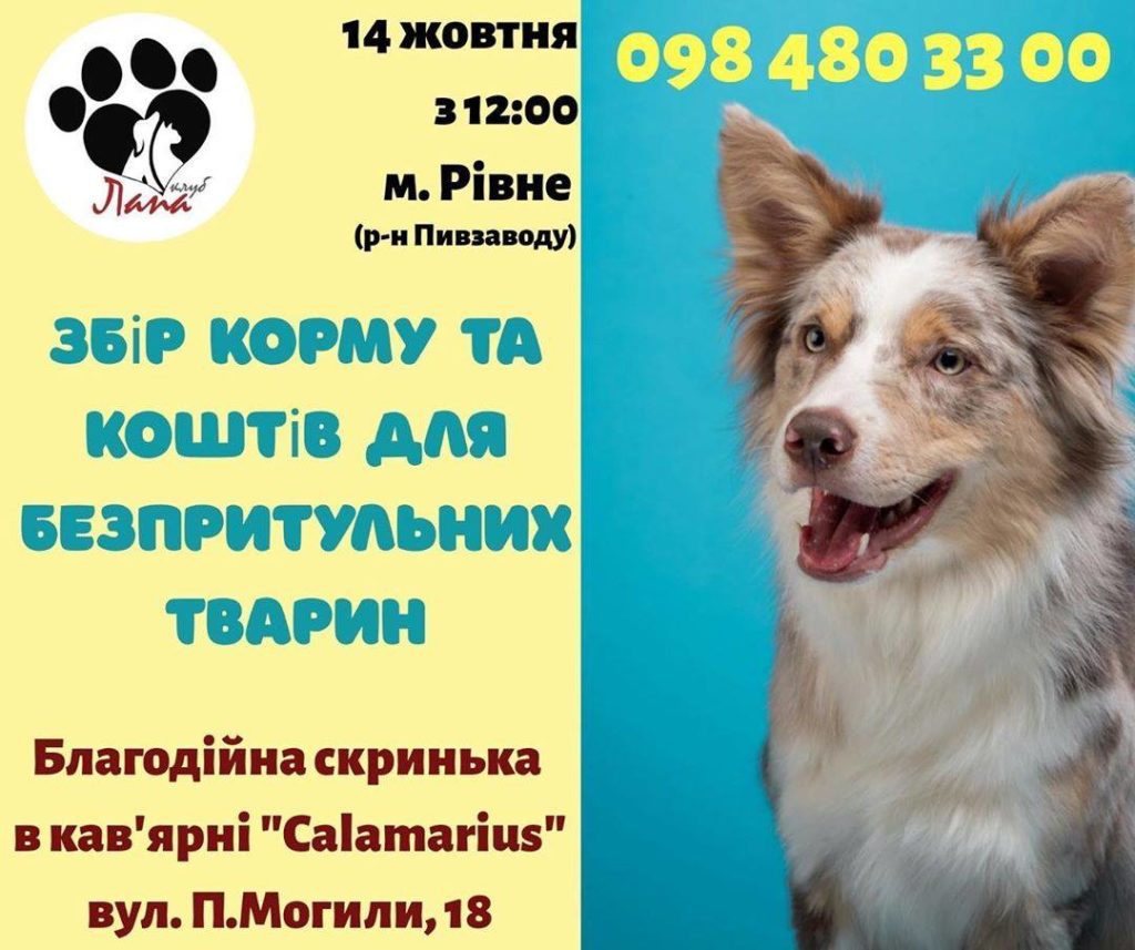 Збір корму та коштів для безпритульних тварин відбуватиметься з 12 до 18 години в районі Пивзаводу. А саме, кав`ярня «Calamarius», по вулиці П.Могили, 18.